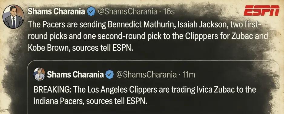 北京时间2月6日,据名记Shams报道,快船与步行者达成一笔2换5的交易,前者送出祖巴茨和科比·布朗,从后者引入马瑟林、以赛亚·杰克逊、2个首轮签(2026年受保护,2029年无保护)以及1个次轮签。